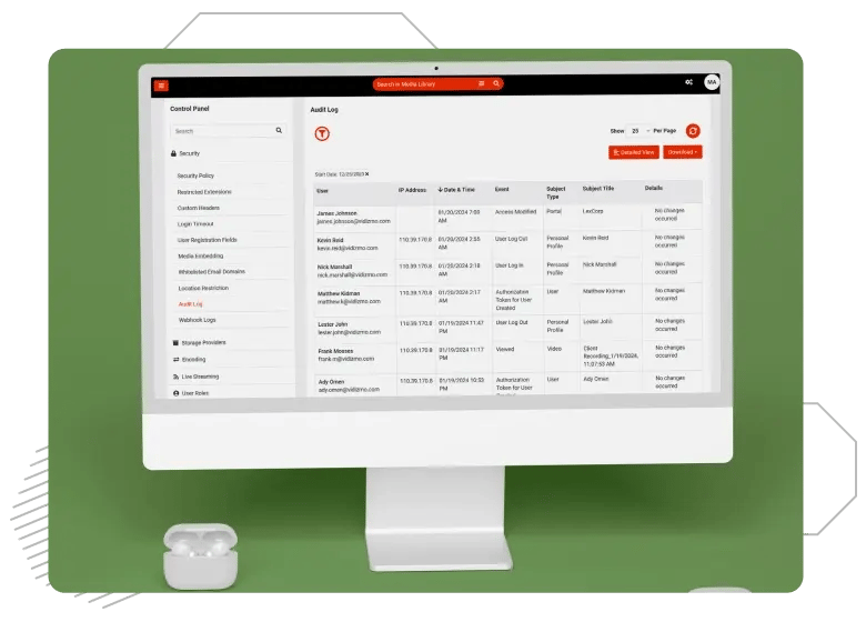 View and download detailed audit logs that track every activity on your portal. From media interactions to setting adjustments, user additions/deletions, or more, maintain chronological records for comprehensive oversight and management.